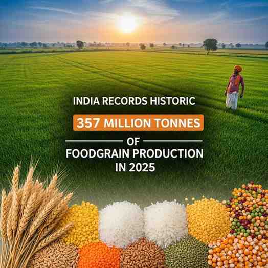 Prime Minister Narendra Modi announced that India has achieved a landmark 357 million tonnes of foodgrain production in 2025 , marking one of the highest outputs in the nation’s agricultural history. Sharing the milestone during the 128th episode of Mann Ki Baat , he noted that the country has added 100 million tonnes to its annual production over the past decade—reflecting improved food security, rising farm productivity and growing self-reliance.