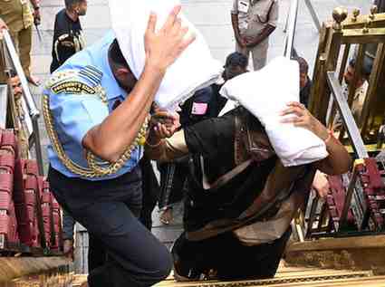- She was received by Kerala Devaswom Minister V. N. Vasavan and Travancore Devaswom Board President P. S. Prasanth , and welcomed with a poorna kumbha by Tantri Kandararu Mahesh Mohanaru . Temple priests led rituals and pujas during her visit.
