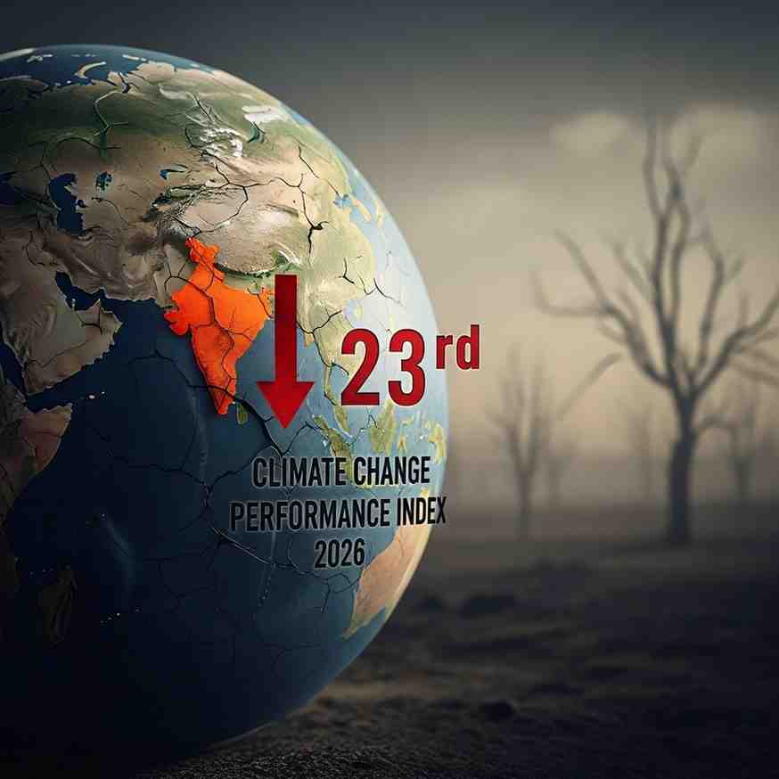 India has recorded one of its sharpest declines in the Climate Change Performance Index (CCPI) 2026 , falling 13 places to rank 23rd . The assessment indicates mounting concerns over rising greenhouse gas emissions, heavy reliance on coal and insufficient carbon pricing measures, despite India’s strong momentum in expanding renewable energy installations.