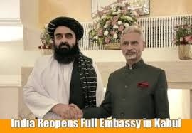 - India has reopened its full-fledged embassy in Kabul , marking its first complete diplomatic return to Afghanistan since the Taliban takeover in August 2021 . The move reflects New Delhi’s effort to safeguard its strategic and developmental interests while countering Chinese and Pakistani influence in the region.